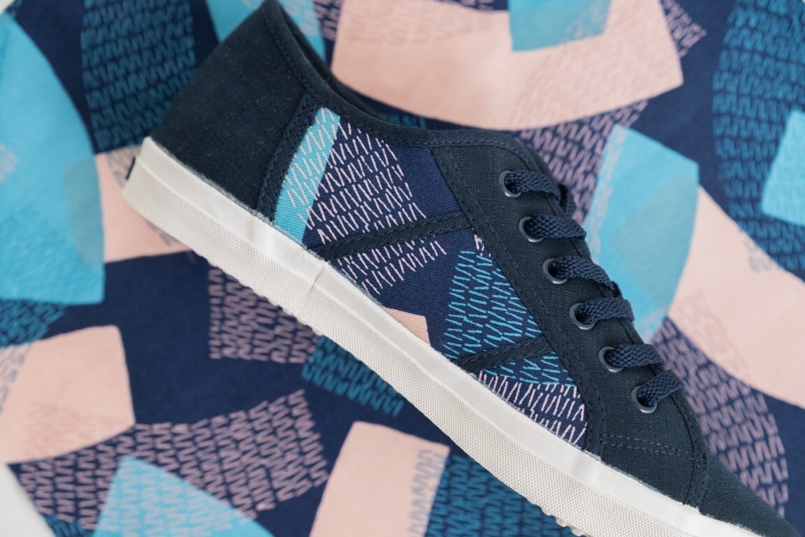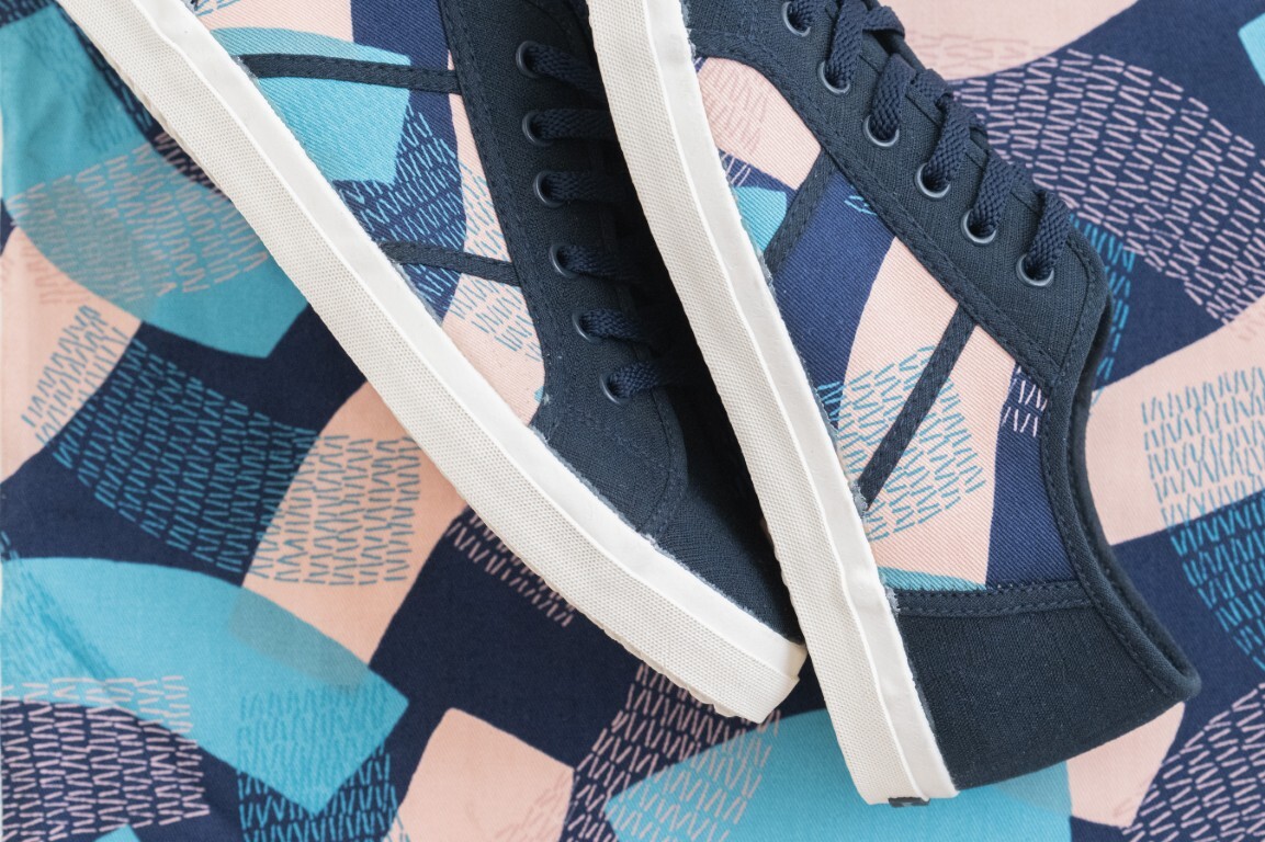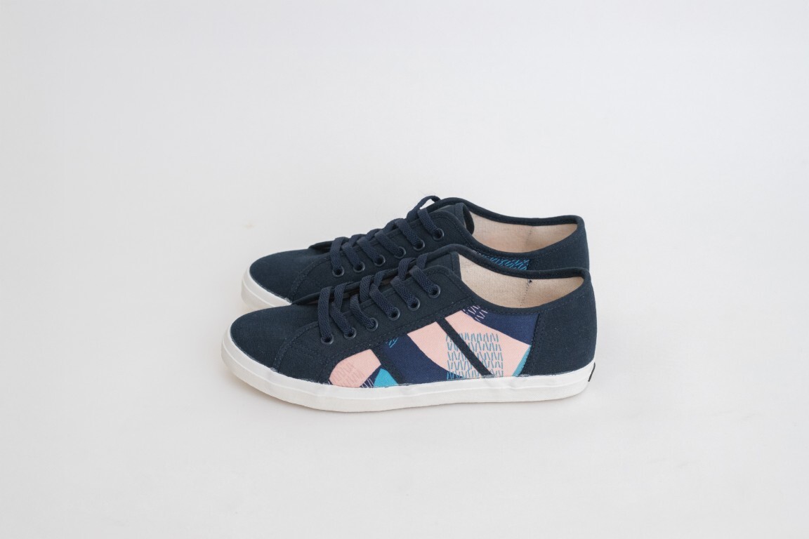 柄モノスニーカーになりますが、ネイビー生地が控えめで、横の部分に柄のある生地をあしらっているので程よい落ち着きの個性のある素敵なスニーカーに仕上がっています。